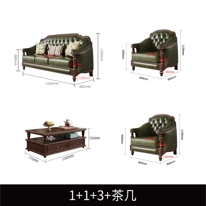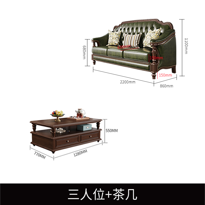 美式实木真皮沙发头层牛皮复古风家用客厅办公室简美乡村组合家具