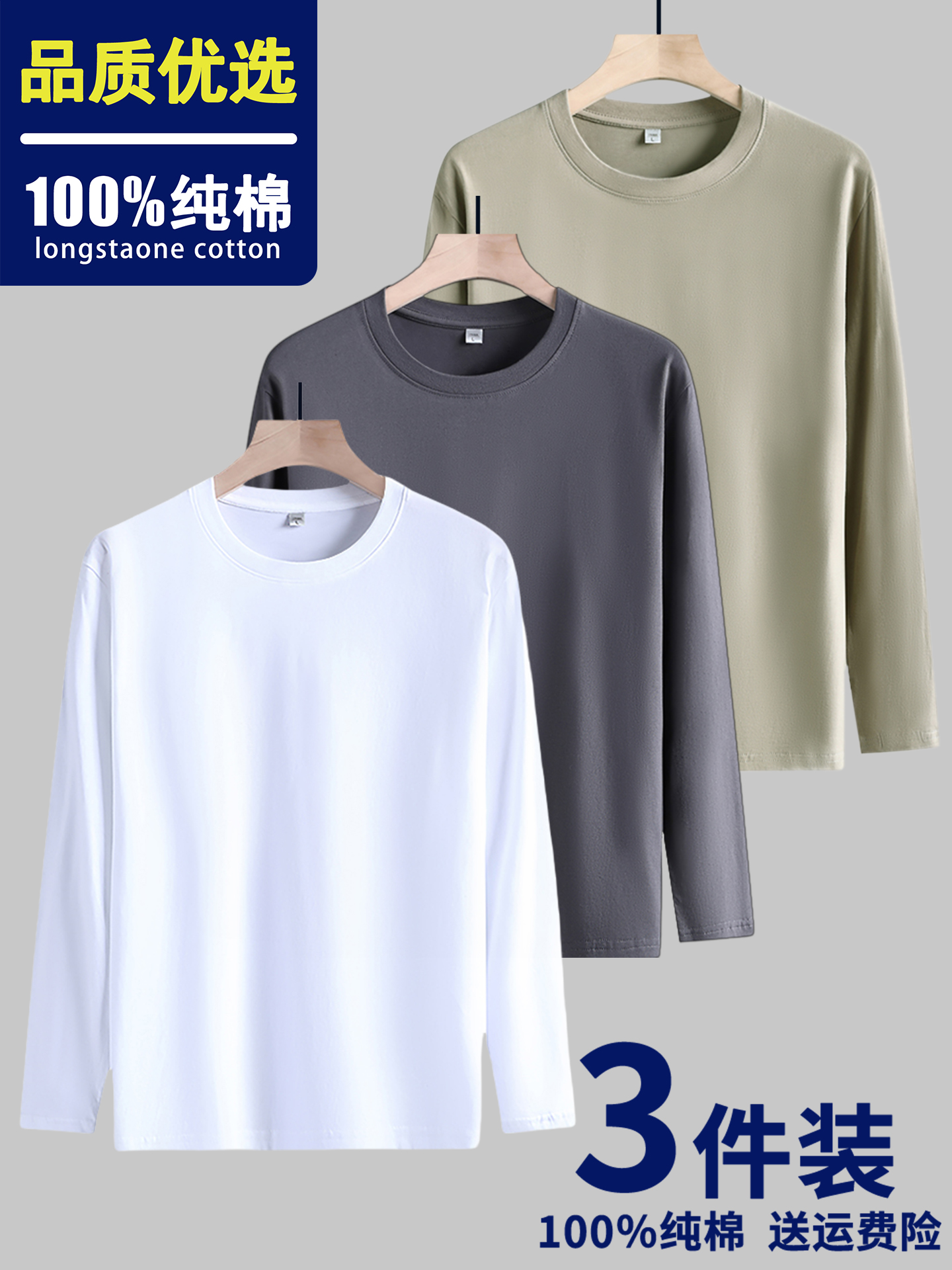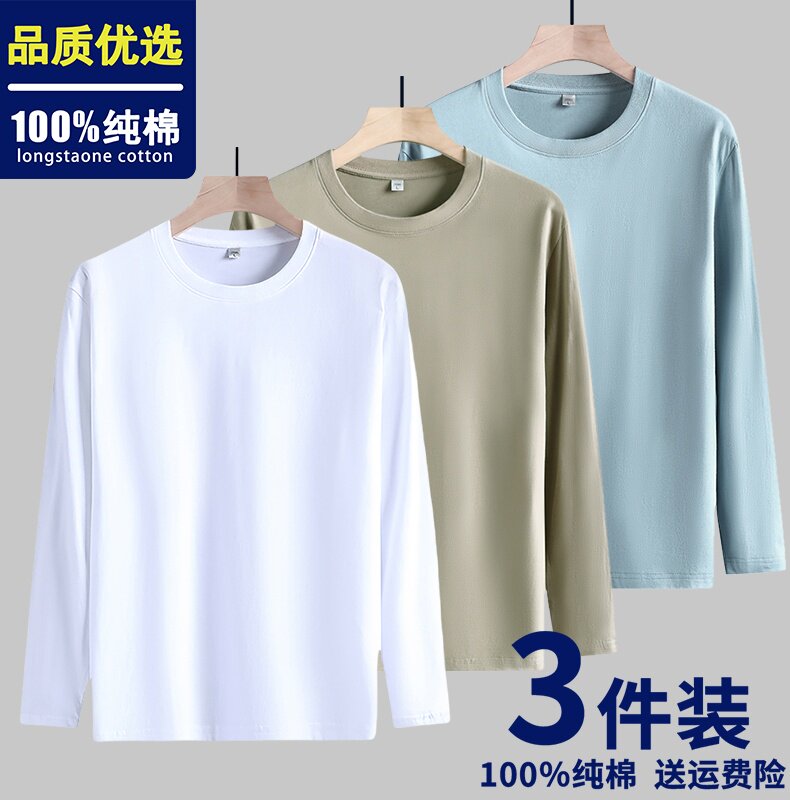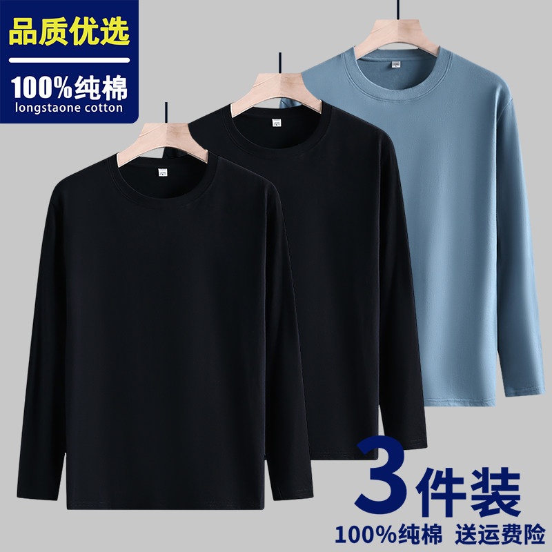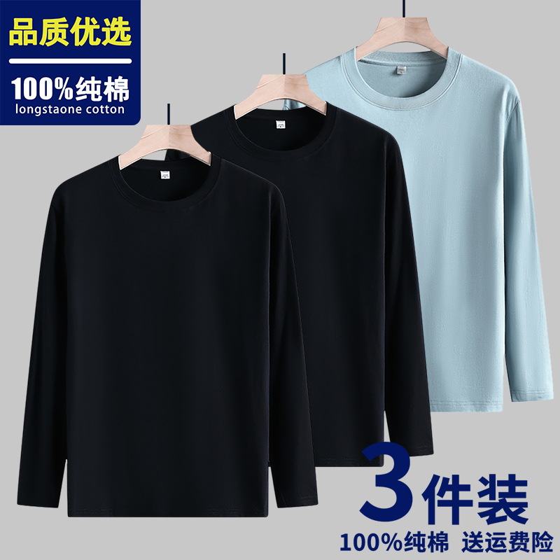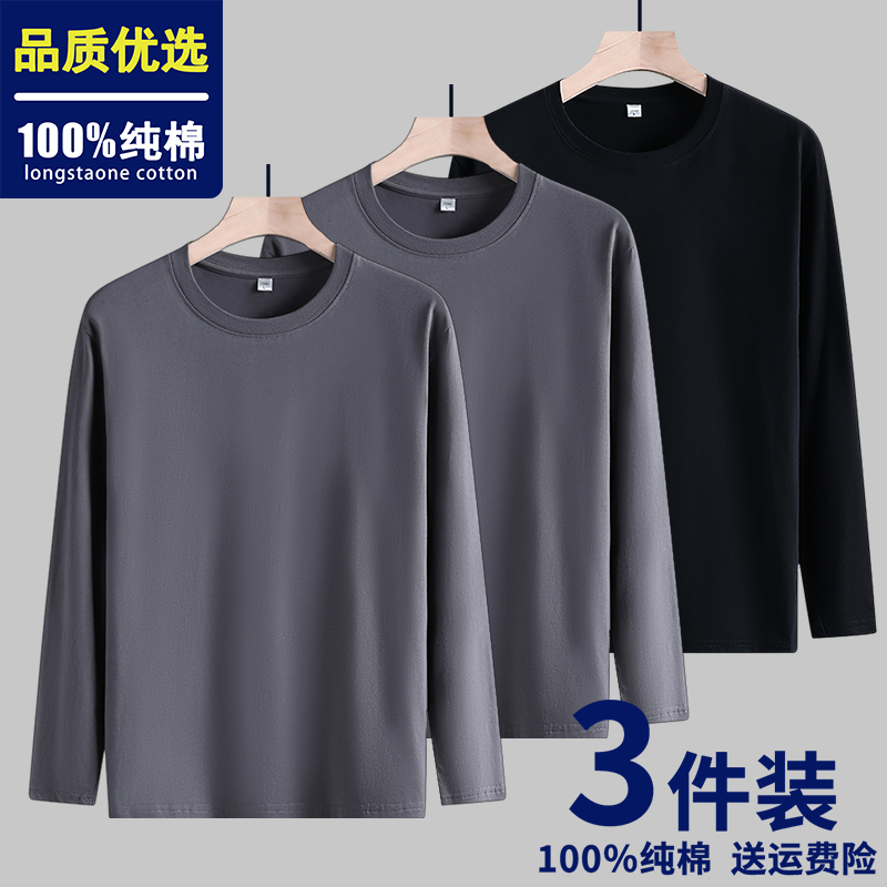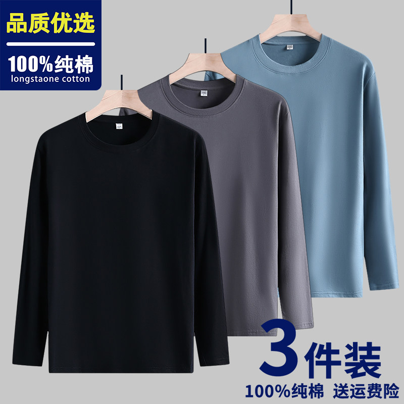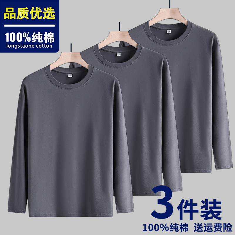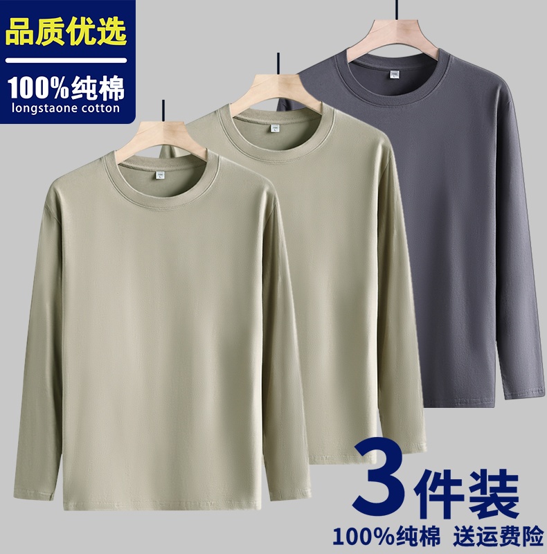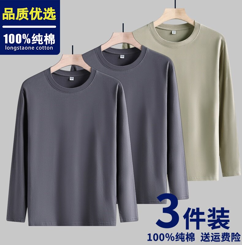 【3件装】新疆长绒棉长袖T恤纯色全棉男款内搭圆领宽松打底衫秋衣